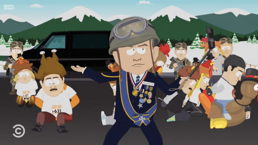 In Wednesday’s Season 28 episode ‘Turkey Trot’, Saudi Arabia sponsors the town’s titular Thanksgiving race as all of South Park sets their sights on the $5,000 prize, and Pete Hegseth sets his sights on the local police department in attempt to get Peter Thiel out of jail at the president’s request.