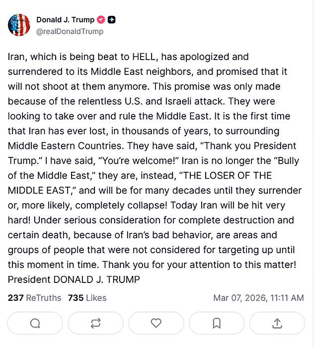 In a statement on Truth Social, Trump hit out at Iran’s President Masoud Pezeshkia, who earlier claimed that attacks against its Gulf neighbours would stop – only to be contradicted by Iran’s Revolutionary Guards hours later.